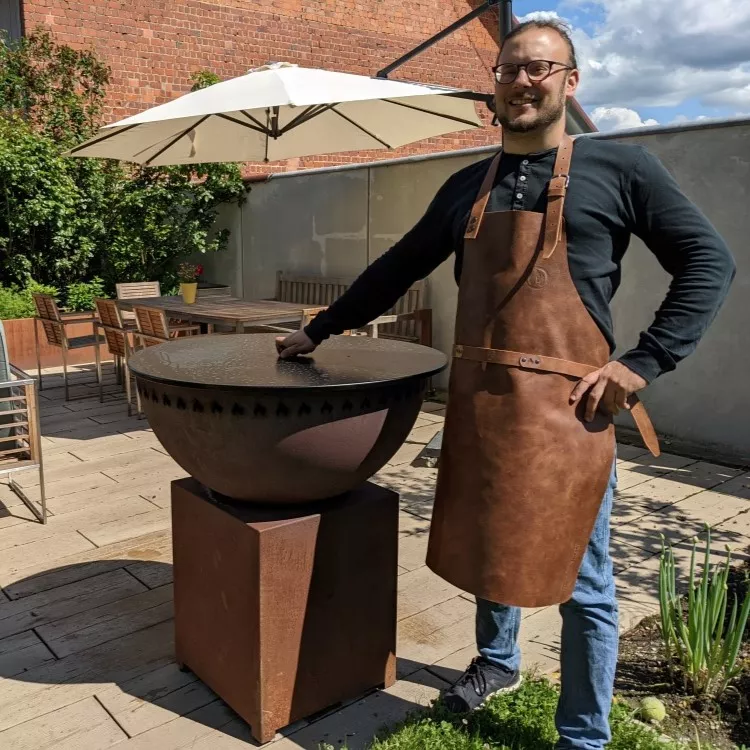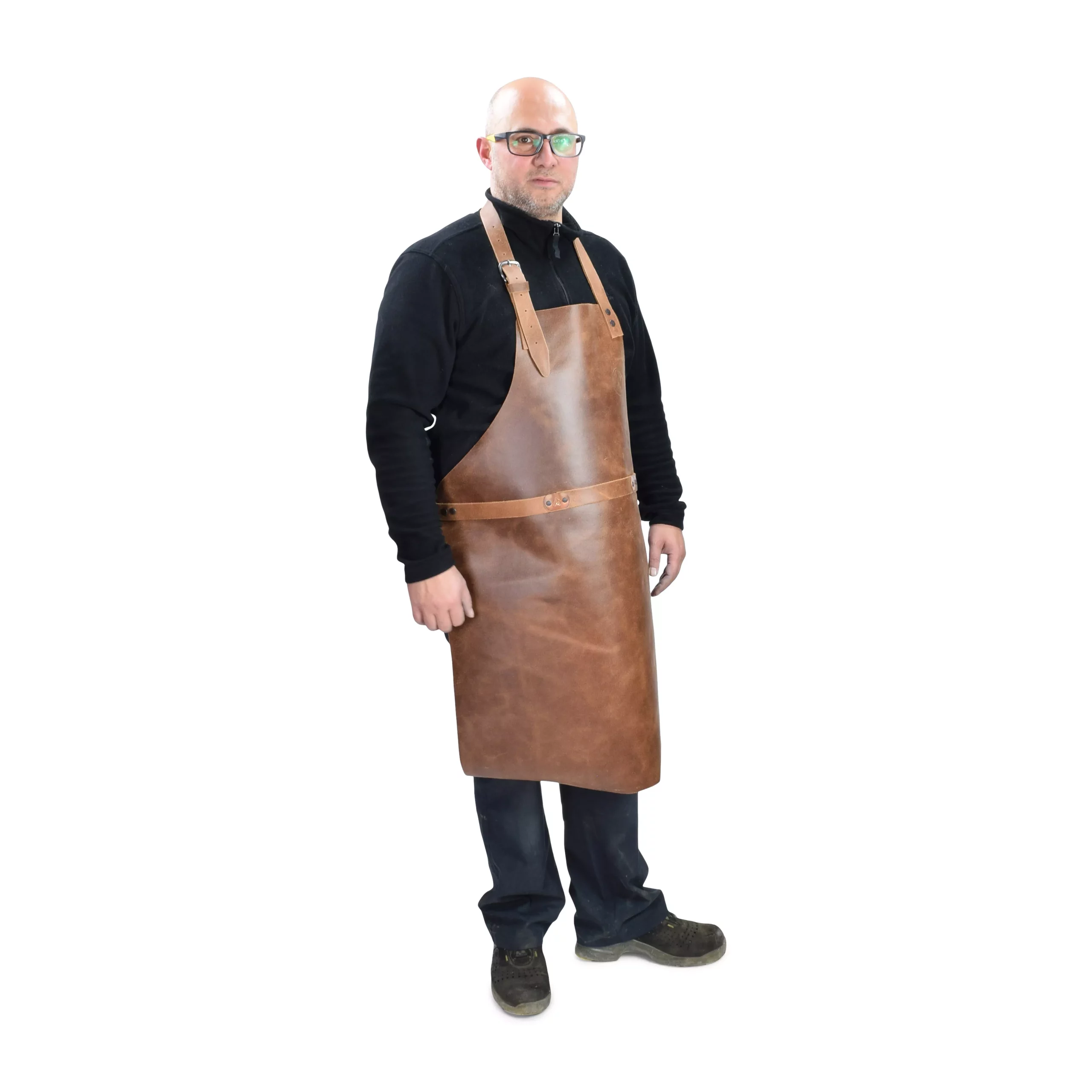 A barbecue apron made of cowhide, with noble copper fittings and solid straps. The perfect gift for real barbecue chefs.