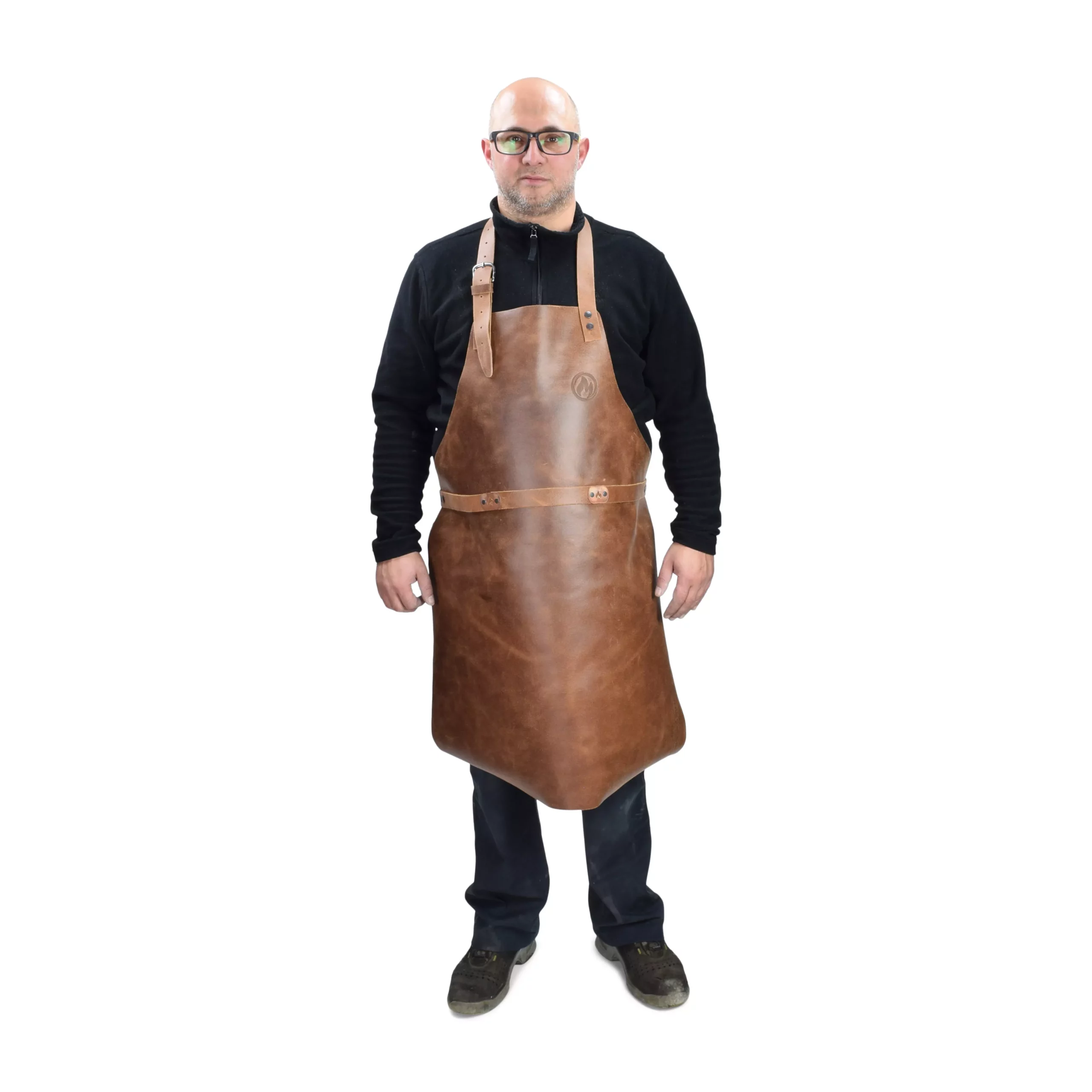 The inside is made of suede, which makes it very comfortable to wear. The leather apron has a circumferential strap with two copper fittings for inserting gloves or barbecue tongs.