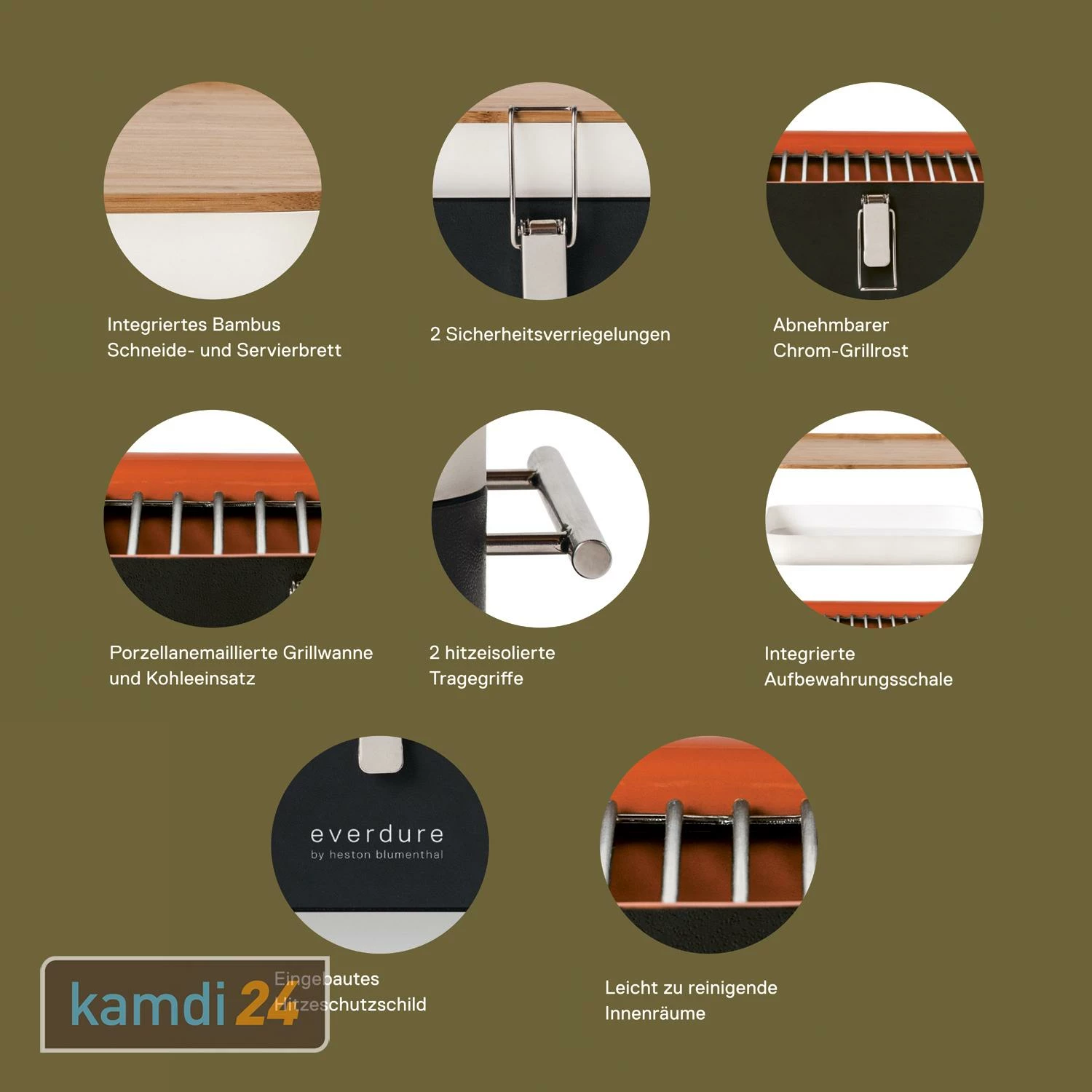 überzeugt nicht nur mit seinem schicken Retro-Design, sondern auch mit dem clever integrierten Zubehör. Das Bambus-Brett, das während des Transports den Grill sicher verschließt, dient als Schneide- oder Servierbrett. Zudem ist eine Aufbewahrungsschale untergebracht, in welcher Sie Kohle, Grillgut oder Zubehör zwischenlagern können.