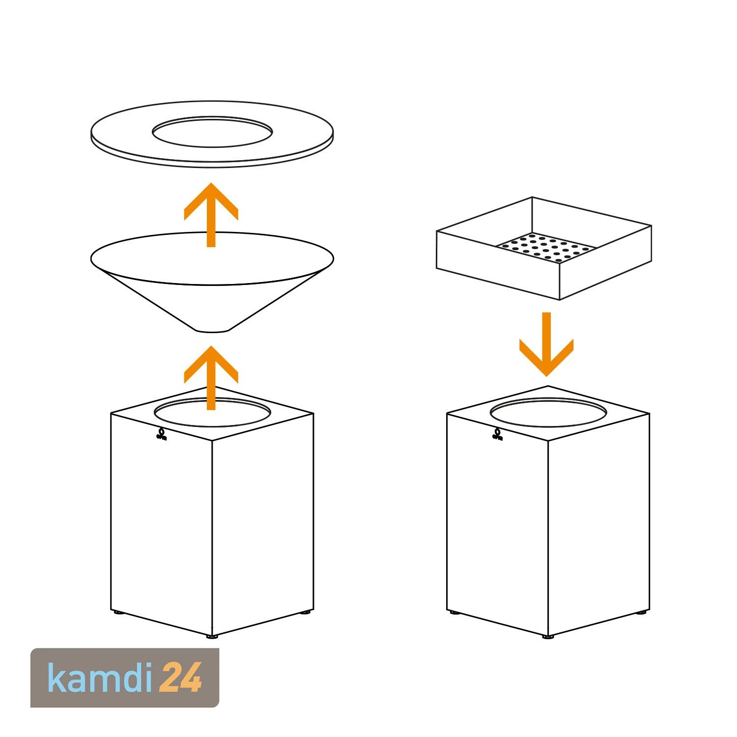 Der Sockel besteht aus hellem Cortenstahl, dessen Oberfläche und Farbe sich mit der Zeit immer weiter verändern. Aufgrund der Korrosion kann es in Verbindung mit Wasser zu Flecken auf hellen Stein- und Holzoberflächen kommen sowie zu sichtbaren Fettspritzern vom Grillen. Bei Nichtverwendung wird eine Lagerung im Innenbereich empfohlen.