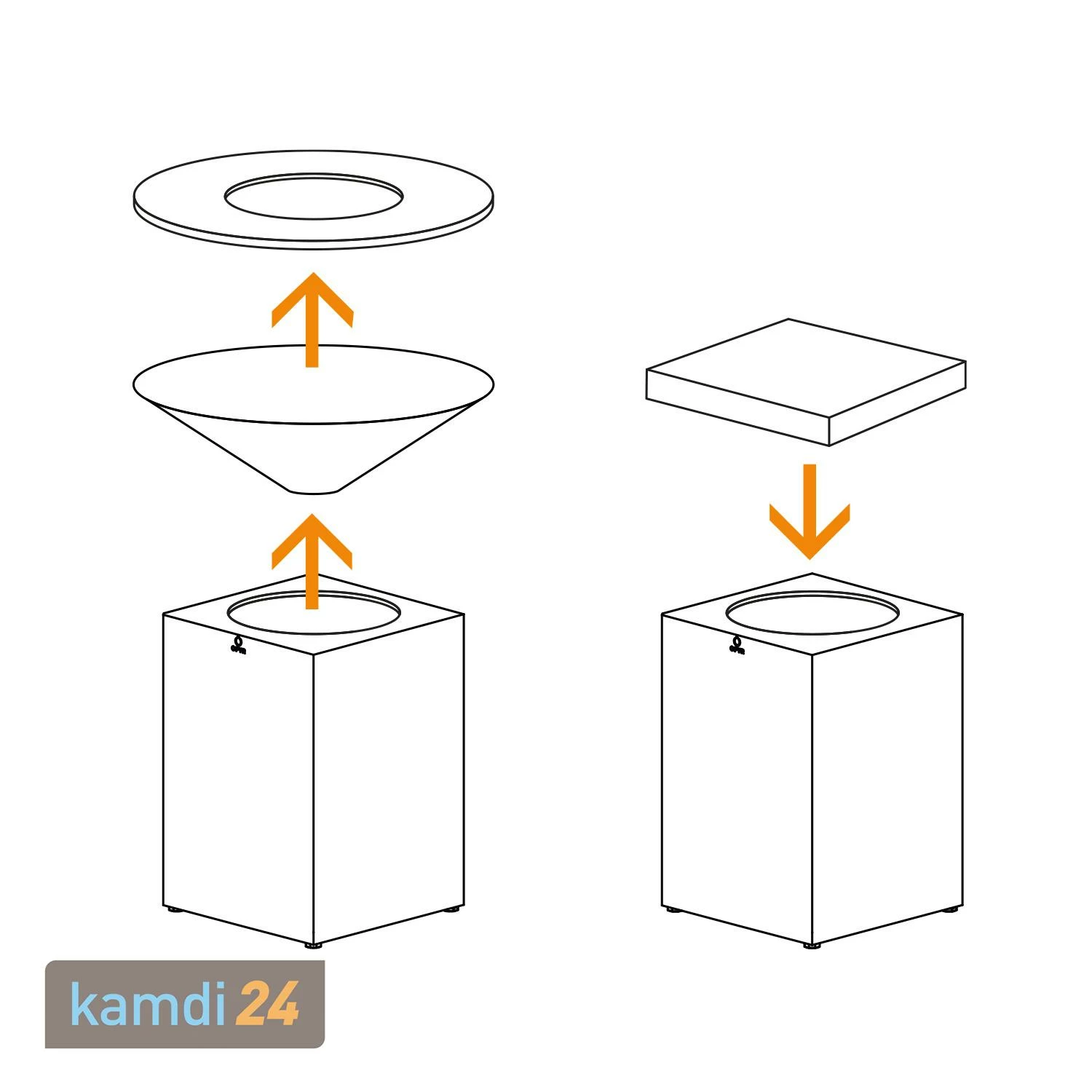 Der Sockel besteht aus hellem Cortenstahl, dessen Oberfläche und Farbe sich mit der Zeit immer weiter verändern. Aufgrund der Korrosion kann es in Verbindung mit Wasser zu Flecken auf hellen Stein- und Holzoberflächen kommen sowie zu sichtbaren Fettspritzern vom Grillen. Bei Nichtverwendung wird eine Lagerung im Innenbereich empfohlen.