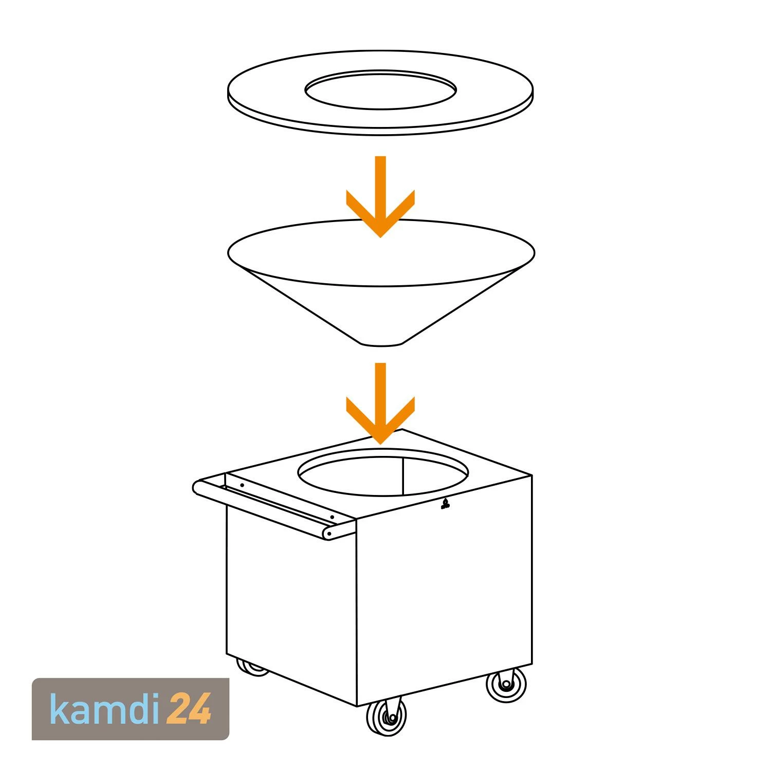 Auf dem bisherigen Sockel Ihres Grills können Sie einen Aufsatz anbringen. Mit diesem lässt sich entweder ein Feuerkorb oder ein Gefäß für Pflanzen- bzw. frische Kräuter erstellen. Dazu befindet sich im Inneren des Aufsatzes eine Entwässerung. Das zweite Extra ist ein Teakholzblock, den Sie als Arbeitsplatte umfunktionieren können – Teakholz ist ein robustes Material, das jedoch trocken gelagert werden muss. Für die Zubereitung von Lebensmitteln wird ein geeignetes Schneidebrett empfohlen. Ihren Favoriten wählen Sie im Varianten-Menü aus.