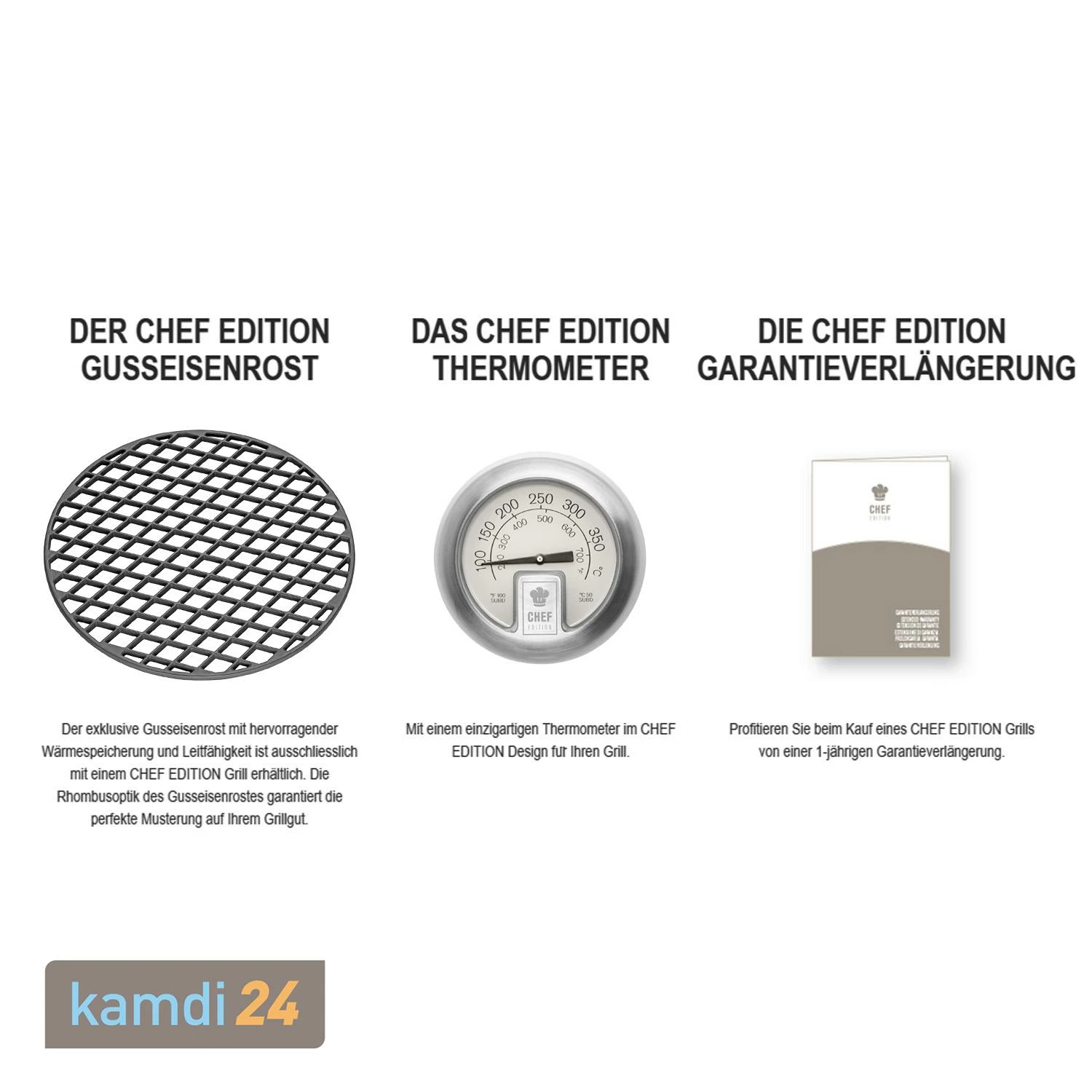 In diesem erhalten Sie den Gasgrill. Die Chef Edition besteht aus einem hochwertigen Gusseisenrost, einem Deckelthermometer in Chef Edition Design sowie einer Garantieverlängerung!
