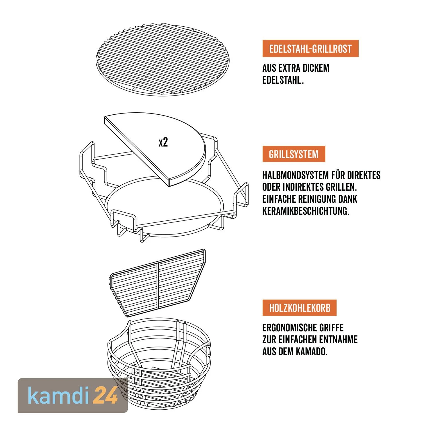 Standardmäßig ist der Grill mit zwei schwarz beschichteten Wärmedeflektoren und dem dazu passenden Stahlgestell ausgestattet. Die halbmondförmigen Wärmeplatten ermöglichen das indirekte Grillen mit dem Keramikgrill. Zudem bietet das Gestell zahlreiche weitere Einsatzmöglichkeiten mit dem passenden , wie beispielsweise dem Wok oder weiteren Grillrosten.
