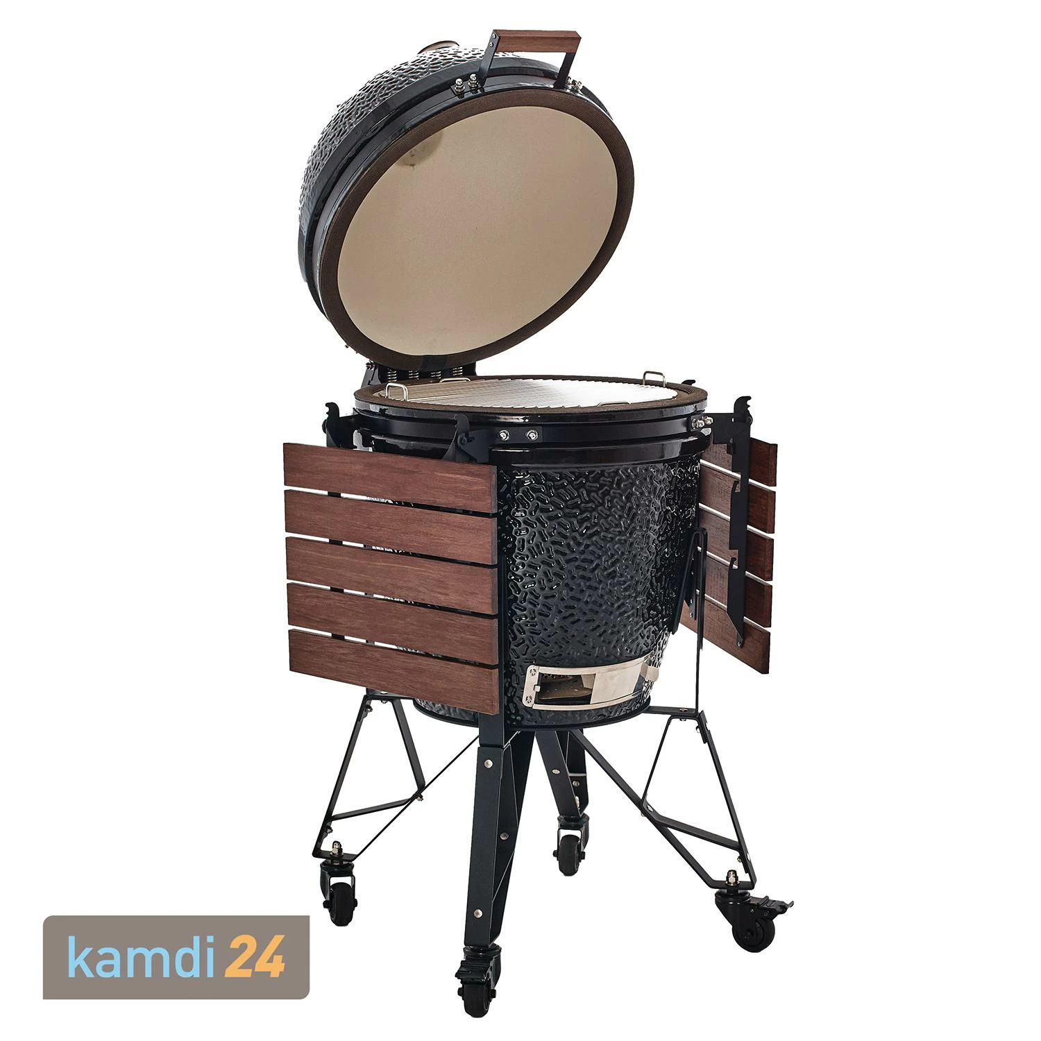 ist der Bestseller des gleichnamigen Herstellers aus den Niederlanden. Seine macht diesen Keramikgrill unglaublich vielfältig in seinen Einsatzmöglichkeiten. Der zweigeteilte, halbmondförmige Deflektor ermöglicht sowohl das direkte als auch das indirekte Grillen. Über das auf der Kuppel steuern Sie die Luftzufuhr und damit die Gartemperatur im Grill. Dank der wird die Wärme optimal im Grill gehalten, ohne zu entweichen. Die beiden von The Bastard Large Complete bieten ausreichend Platz zum Abstellen von Grillzubehör. Und damit der Kamado immer dort steht, wo Sie grillen möchten, ist das Heavy Duty Gestell mit vier Rädern ausgestattet. Das Large Complete Modell punktet zudem mit einer klassischen glänzenden Oberfläche. Über das Varianten-Menü können Sie diesen Grill aber auch mit einer matten Oberfläche auswählen.
