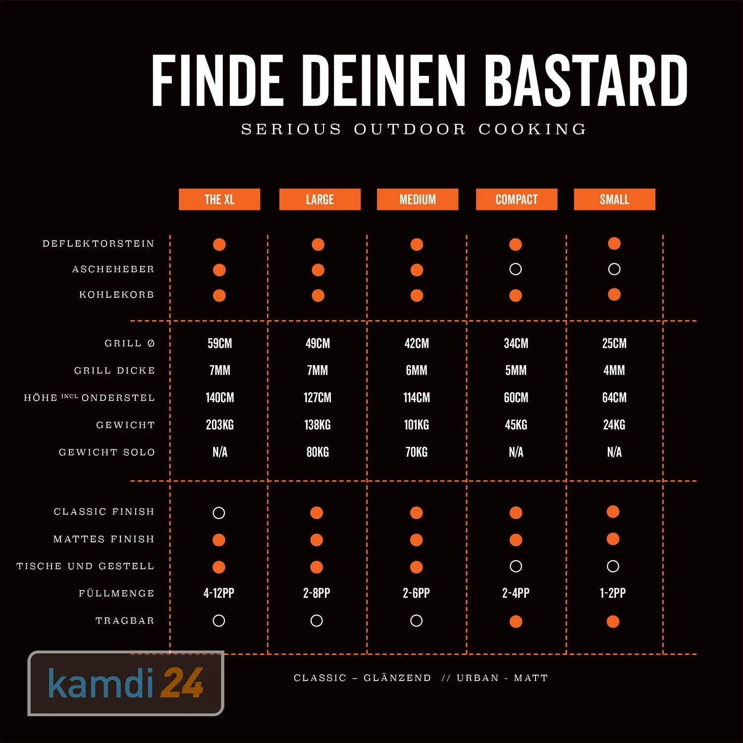 Mit seiner unaufdringlichen Größe passt der einfach in jeden Garten. Dabei ist der des gleichnamigen Herstellers perfekt geeignet für Grillrunden von . Ausgestattet mit einer praktischen Ascheschale, einem geteilten Holzkohlekorb, halbmondförmigen Wärmedeflektoren und einem , ist der sofort einsatzbereit. Die durchdachte Halterung der Wärmedeflektoren kann zudem mit weiterem kombiniert werden. Der Bastard Medium Urban Complete punktet ebenso mit seiner sowie dem Präzisionsrad auf der Kuppel. Dieses ermöglicht die präzise Steuerung der Luftzufuhr, während die Dichtung dafür sorgt, dass die Wärme im Inneren des Grills gehalten wird. Im Komplettpaket des Grills ist zudem ein Heavy Duty Gestell sowie zwei Seitenablagen enthalten.