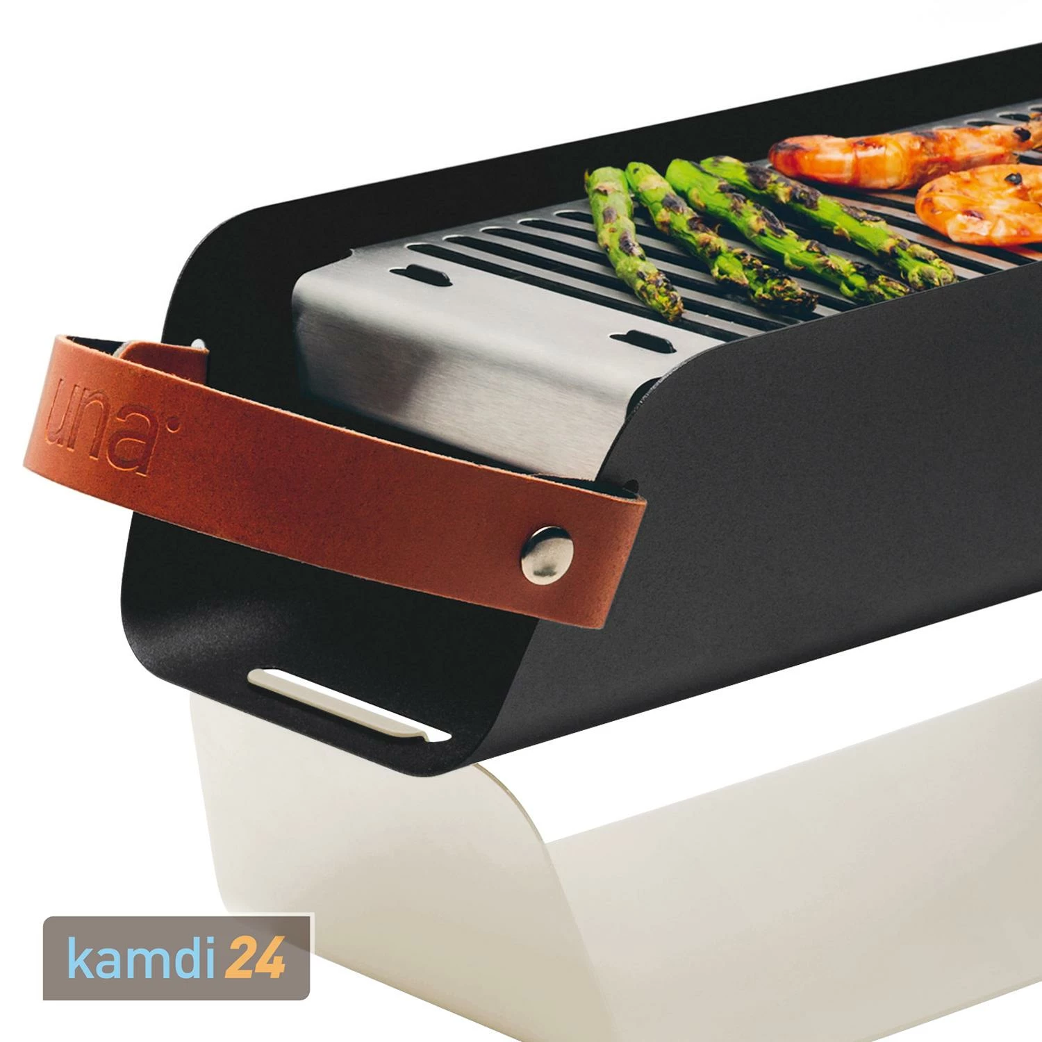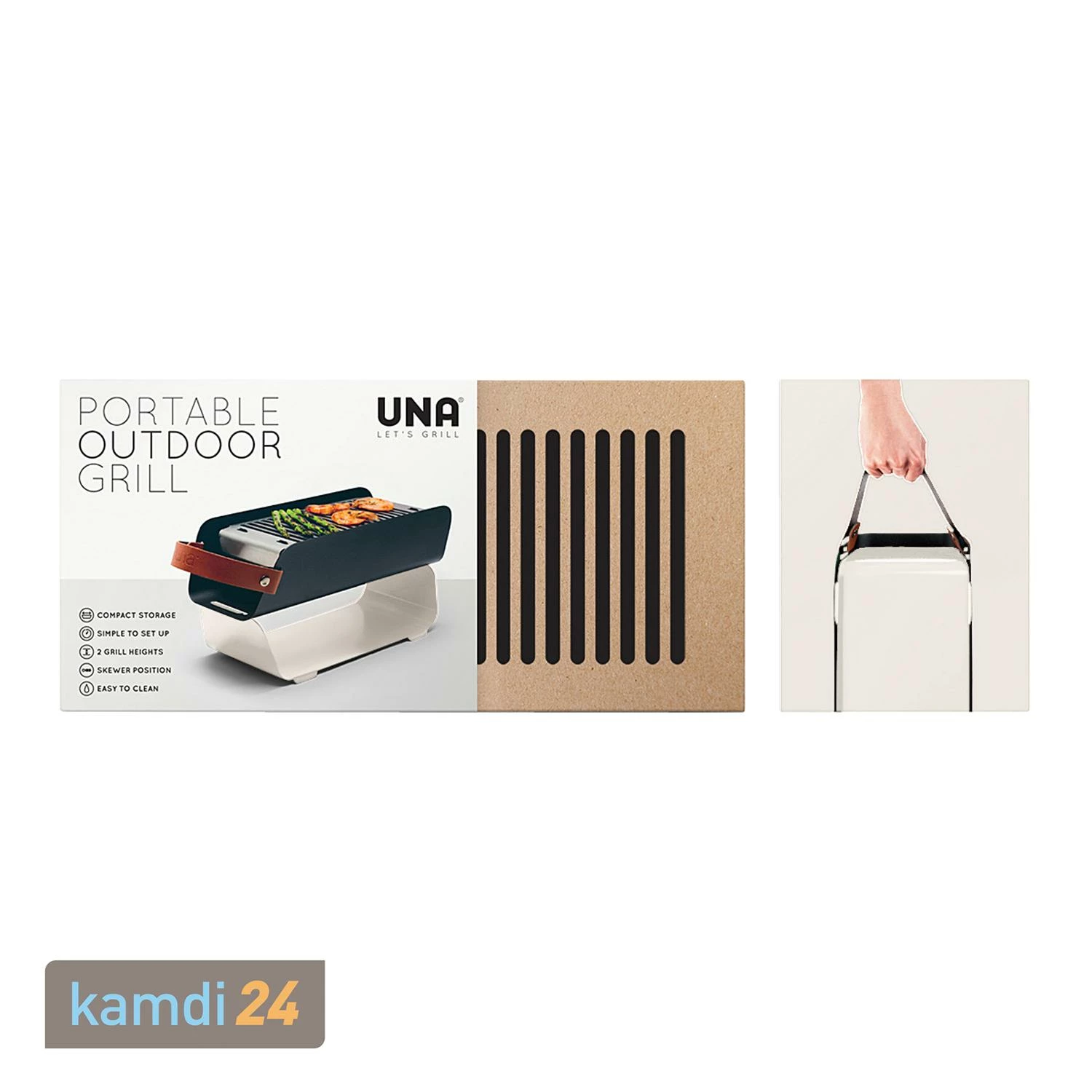 Das ist : Ein kompakter, schicker, intelligent designter , der sich bequem überall mit hinnehmen lässt. Die in seinem integrierten Grillspieß-Halterungen ermöglichen wahlweise das direkte Grillen von Grillgut aller Art oder die Zubereitung von Grillspießen. Im geschlossenen Zustand kann UNA an seinem hochwertigen Lederband getragen und äußerst platzsparend aufbewahrt werden.