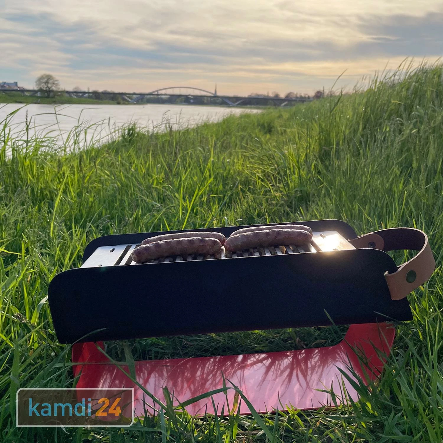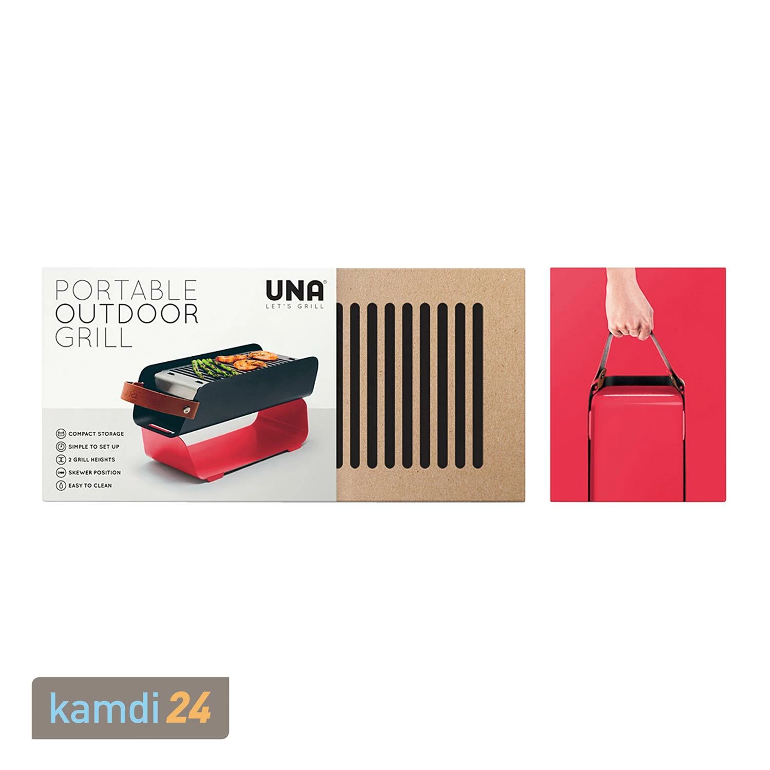 Das ist : Ein kompakter, schicker, intelligent designter , der sich bequem überall mit hinnehmen lässt. Die in seinem integrierten Grillspieß-Halterungen ermöglichen wahlweise das direkte Grillen von Grillgut aller Art oder die Zubereitung von Grillspießen. Im geschlossenen Zustand kann UNA an seinem hochwertigen Lederband getragen und äußerst platzsparend aufbewahrt werden.
