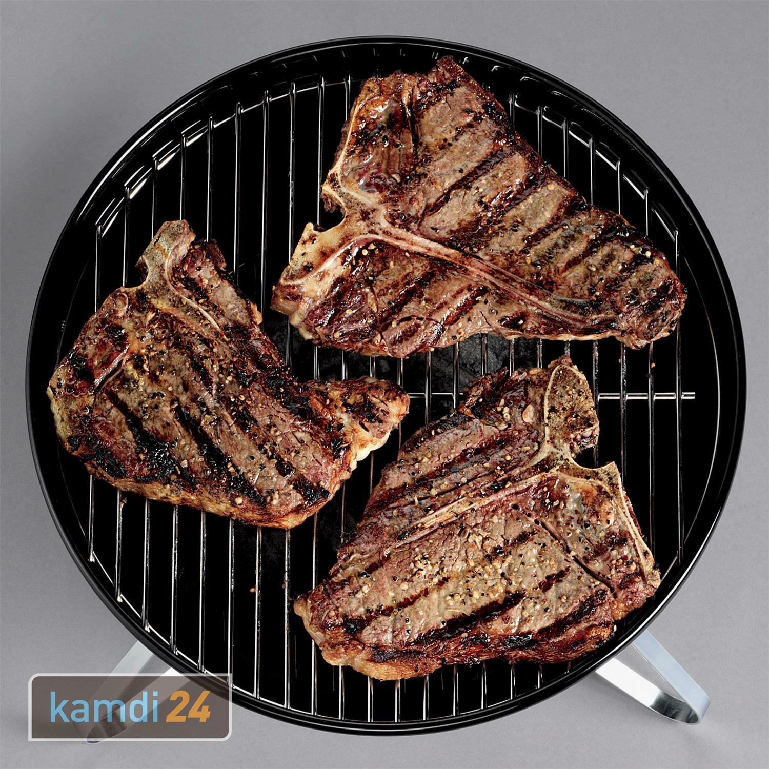 Der stabile Grillrost besteht aus beschichtetem Stahl. Dieser speichert die Hitze optimal und gibt sie gleichmäßig an das Grillgut ab.